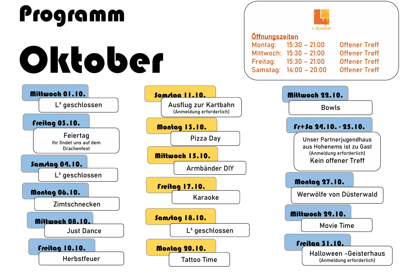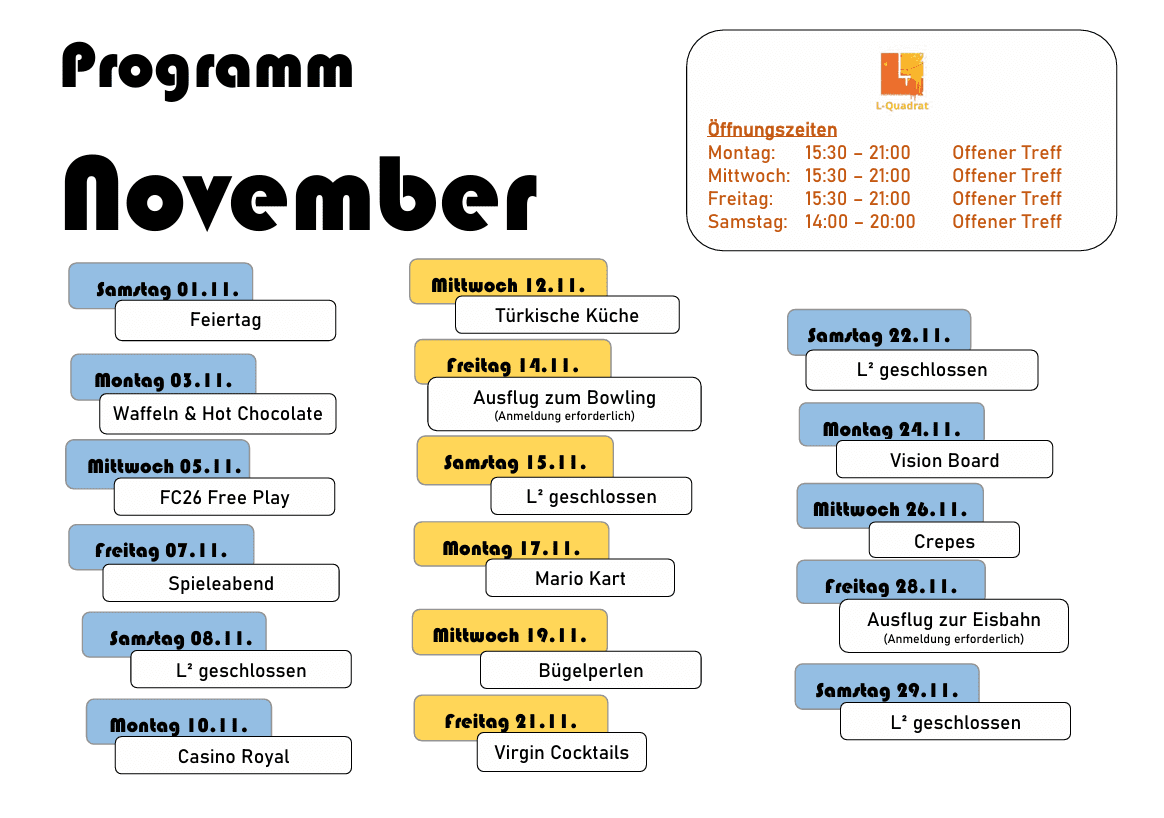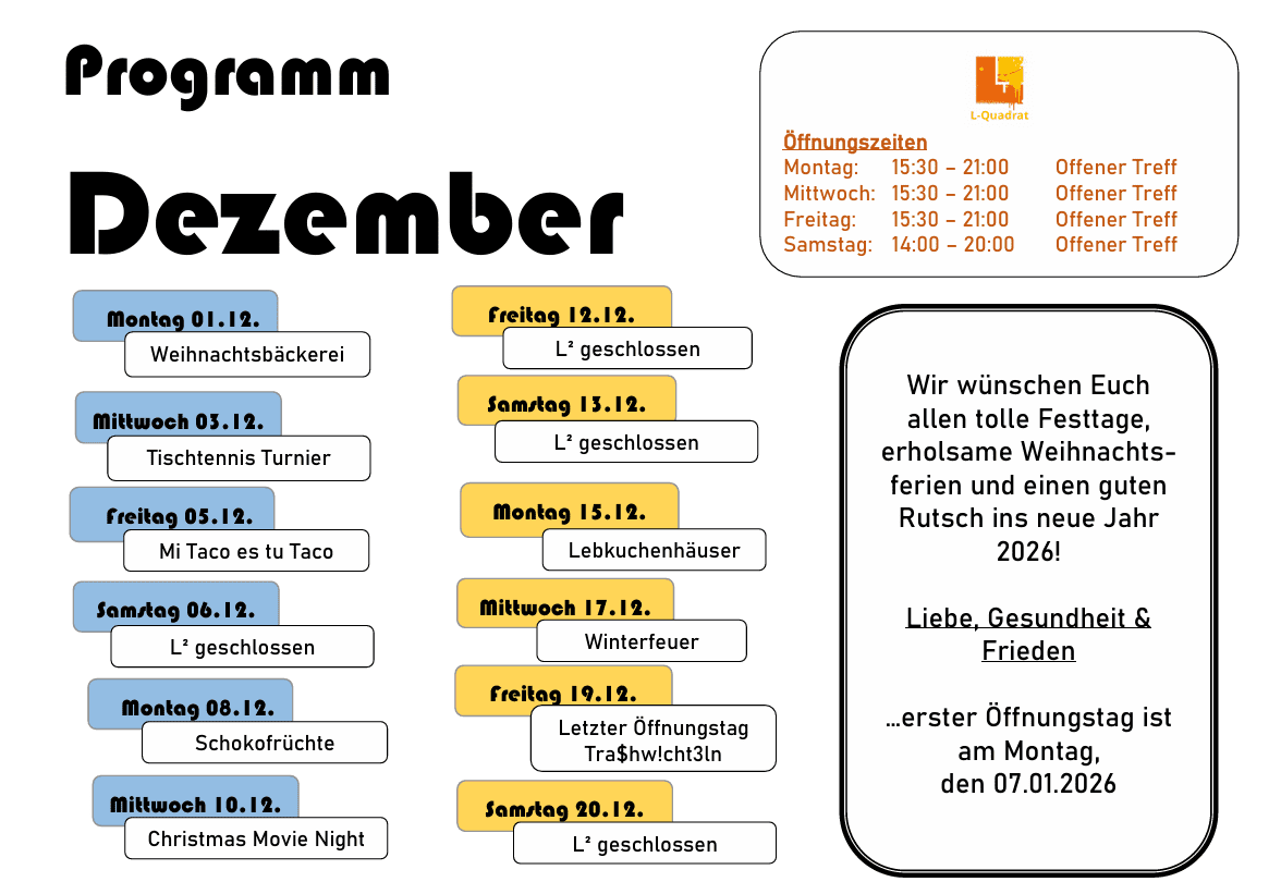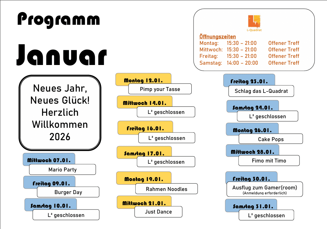 Das L-Quadrat richtet sich als offener Treffpunkt an Jugendliche ab 10 Jahren. Die Räumlichkeiten bieten viel Platz, um aktiv zu sein. Unter anderem stehen ein großer Veranstaltungsraum, ein Café mit angrenzender Küche und ein großer Tanz- und Bewegungsraum zur Nutzung bereit. Durch die direkte Anbindung an das Trendsportfeld ist das Angebot der Freizeitgestaltung auch unter freiem Himmel besonders vielfältig. Seit 2009 besteht eine aktive Partnerschaft mit der offenen Jugendarbeit Hohenems in Österreich.