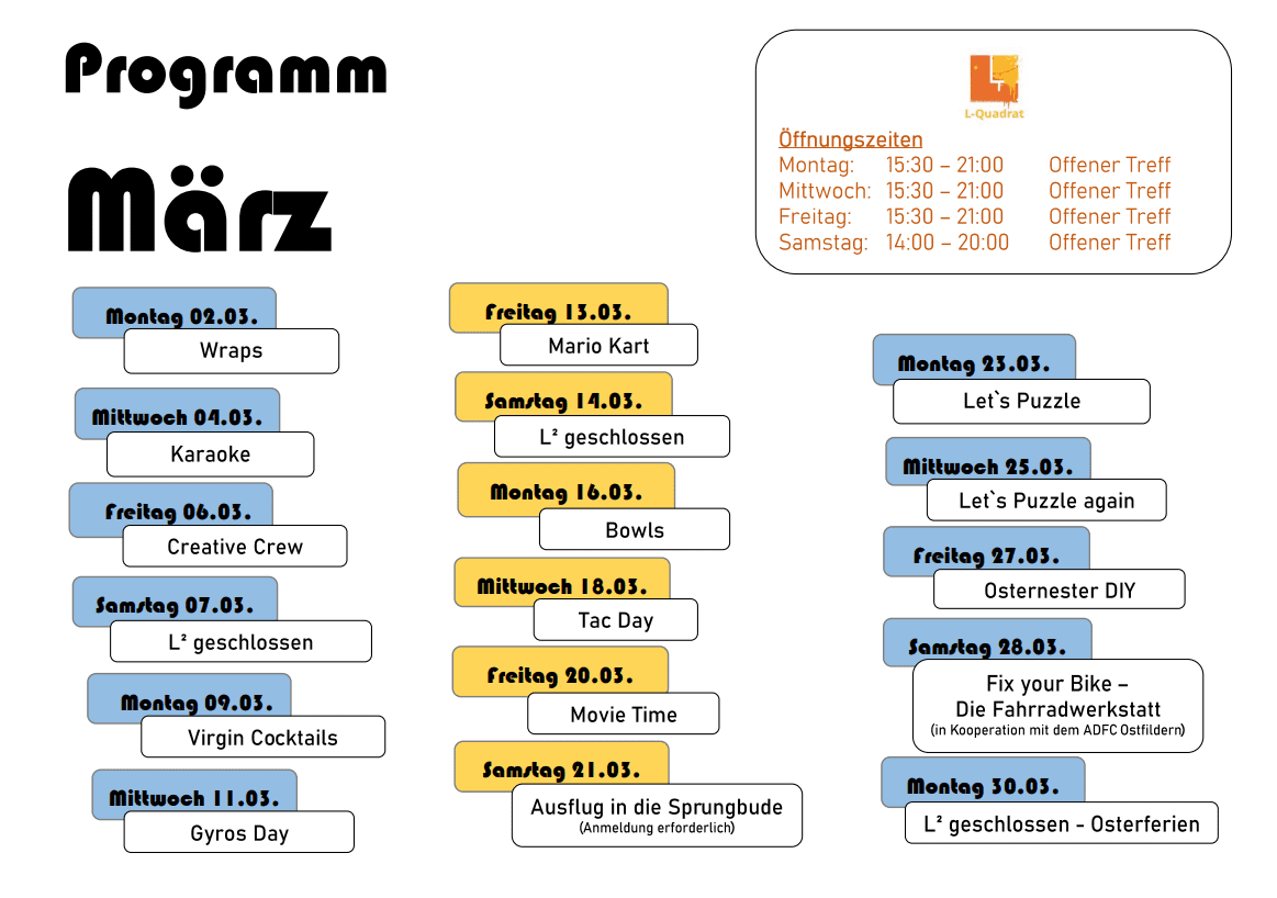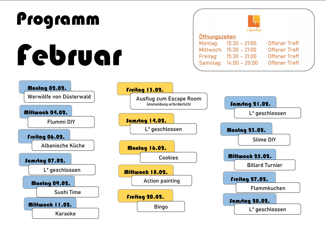 Das L-Quadrat richtet sich als offener Treffpunkt an Jugendliche ab 10 Jahren. Die Räumlichkeiten bieten viel Platz, um aktiv zu sein. Unter anderem stehen ein großer Veranstaltungsraum, ein Café mit angrenzender Küche und ein großer Tanz- und Bewegungsraum zur Nutzung bereit. Durch die direkte Anbindung an das Trendsportfeld ist das Angebot der Freizeitgestaltung auch unter freiem Himmel besonders vielfältig. Seit 2009 besteht eine aktive Partnerschaft mit der offenen Jugendarbeit Hohenems in Österreich.